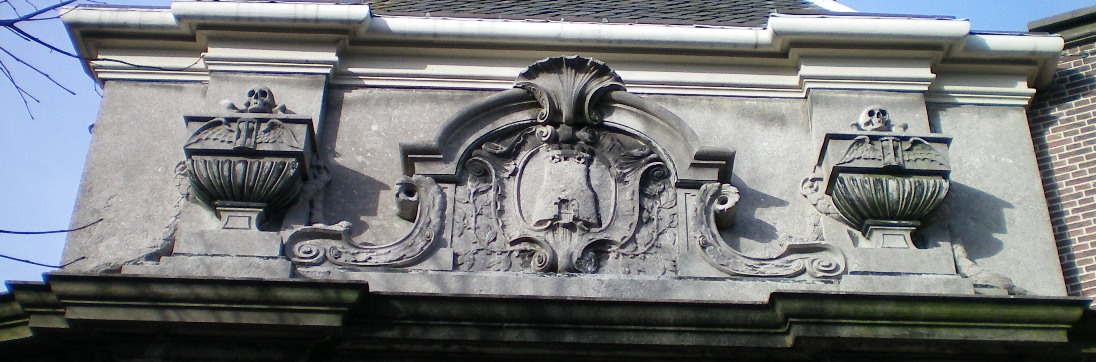 Ook in natuursteen kon de steenhouwer zich uitleven. In het midden het wapenschild